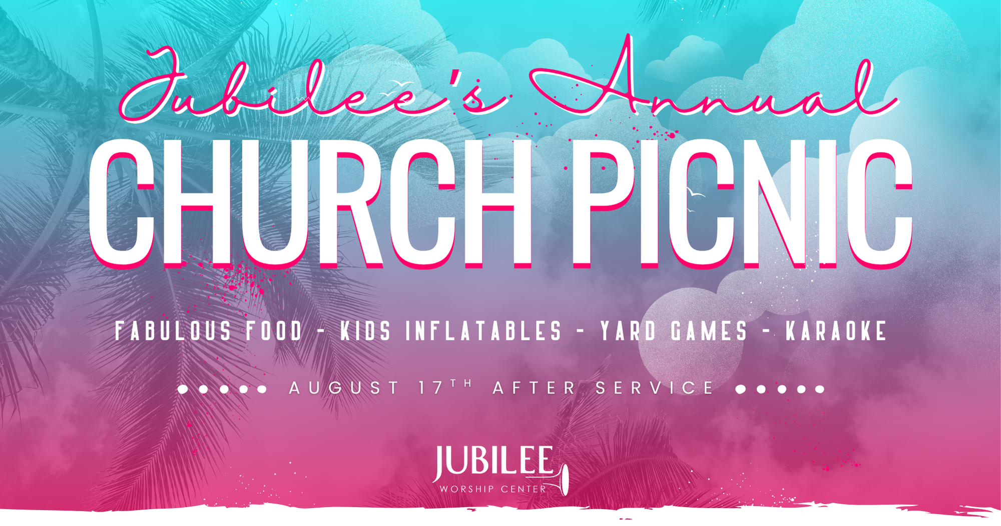 You are invited to Jubilee's Annual Church Picnic! Fabulous Food! Kids Inflatables! Yard Games! Karaoke! Sunday, August 17th following the morning service on the church grounds Lunch will be provided by Jubilee! Bring a lawn chair or blanket and join us for afternoon of Food, Fellowship & Fun! |